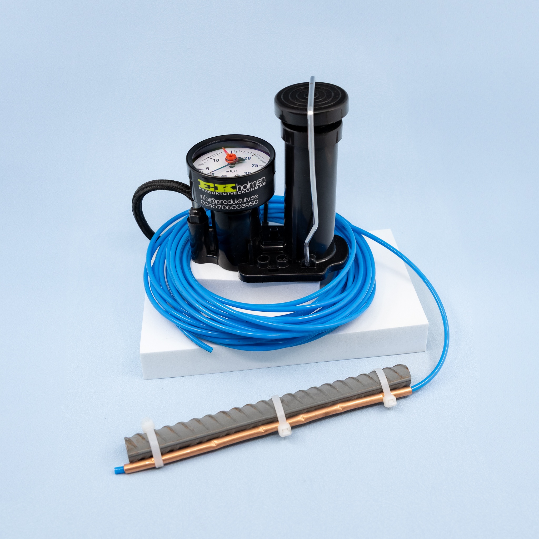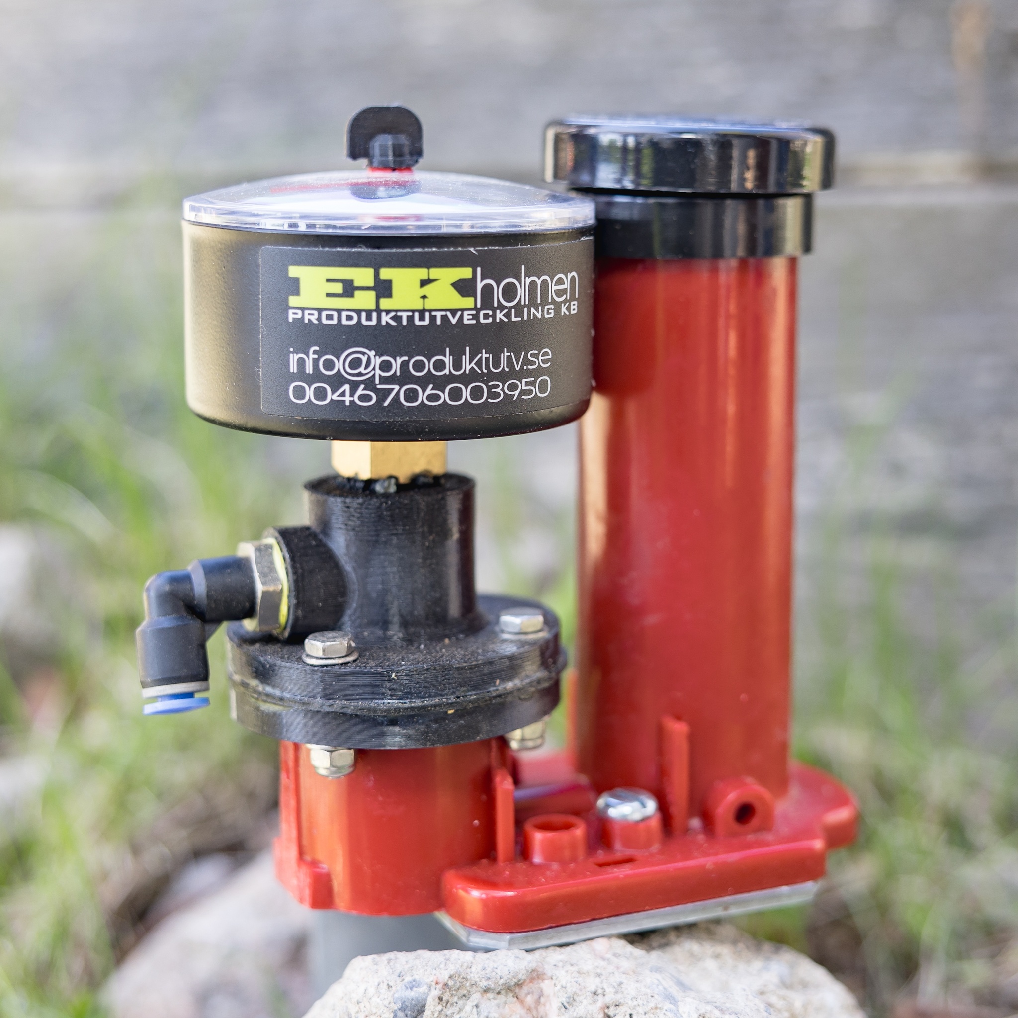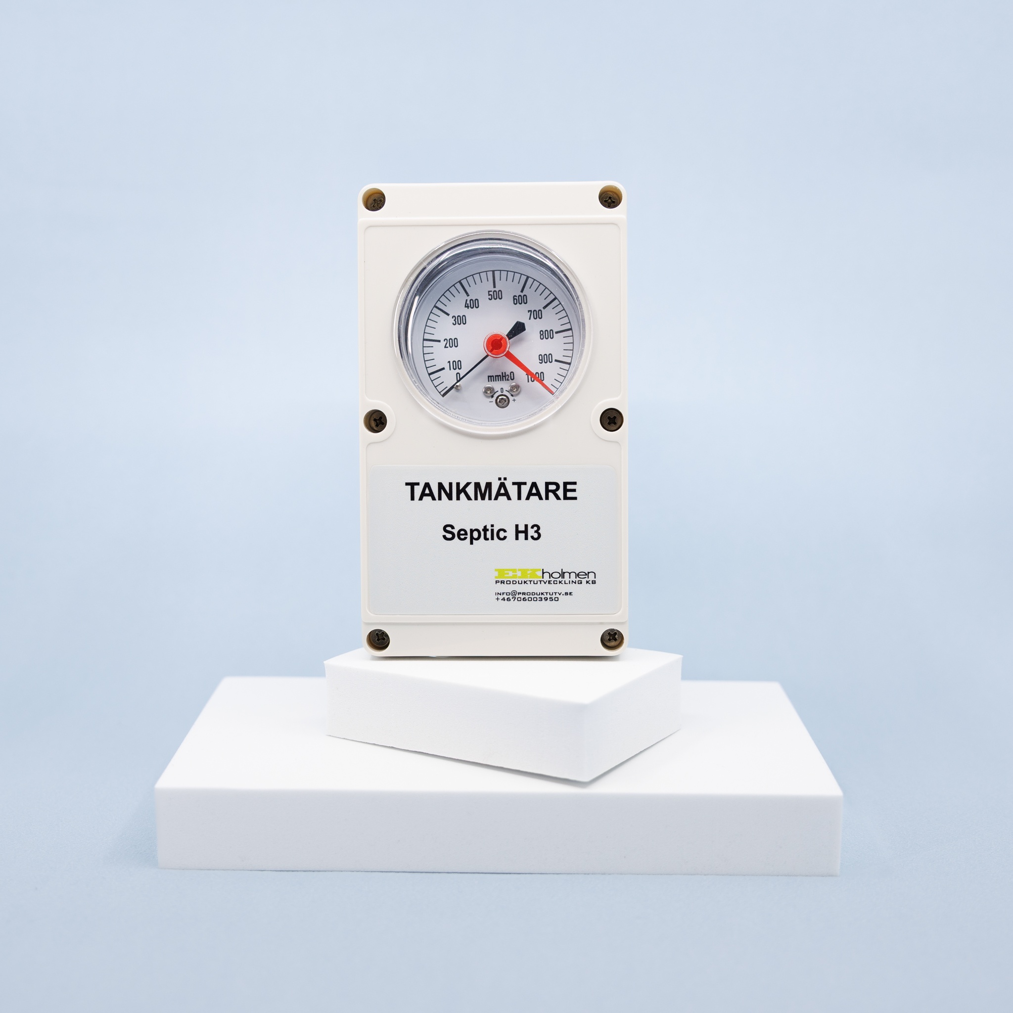 Manuell nivåmätare med batteripump, kapslad. Analog mätare som visar nivån i millimeter.